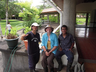 One morning David and I worked in the fields with the workers harvesting pineapples. Lets just say I have a very new appreciation for pineapples. The workers here start at 4:30 and usually work until about noon. We didn't arrive until 5:30 but the harvest was in full swing. As part of the harvesting process we had to wear some nice protective equipment. The first was like an apron but it went down and around your legs and we had arm guards. Even with this equipment our skin got tore up pretty bad just from the pineapple plants themselves. Here we are putting the pineapples in the crates, 10 per crates, which are then loaded up and taken to the processing plant. During our time we also learned how to break the pineapples off the plants. The workers that Ronald has are amazingly efficient and were putting us to shame, but we had a good time with it!